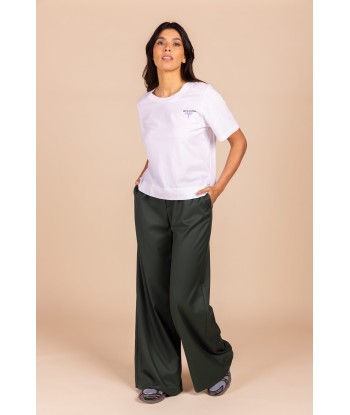 Casual losse broek met brede pijpen in donkergroen. De broek is volledig op elastiek, ze sluit met een rits en een knoop en heeft een trekkoord in de tailleband. De broek heeft 2 steekzakken aan de voorkant en 2 achterzakken die sluiten met een knoop.